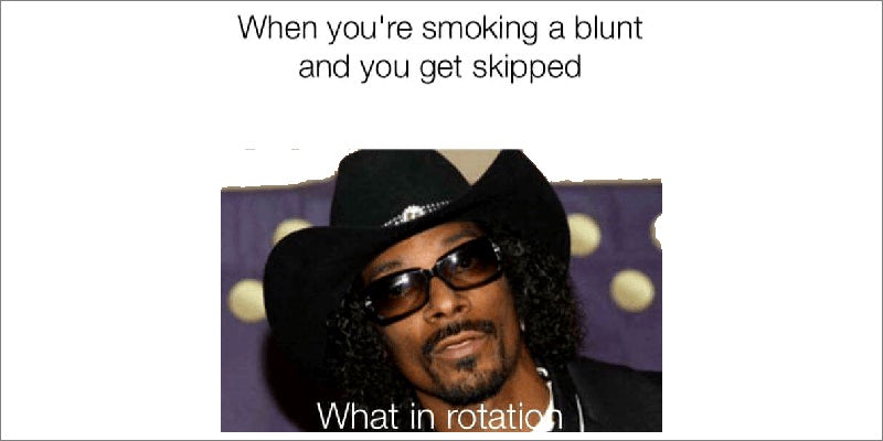 15. What weed? Photo credit 16. When it’s time to smoke your last nug Photo credit 17. That one dealer who is never on time Photo credit 18. Your face after eating too many edibles Photo credit 19. Storytime with the blunt be like… Photo credit 20. Lighter thieves Photo credit 21. What in rotation is going on here? Photo credit During a session, skipping over someone is a big no-no.